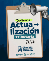 ¿Estás listo para los retos tributarios del 2026? 🚀🧾¡Mantente a la vanguardia de los cambios fiscales este 2026! 📊La Cámara de Comercio de Montería te invita al Seminario de Actualización Tributaria 2026. Un espacio esencial para empresarios, contadores y contribuyentes que buscan entender las nuevas normativas y optimizar su gestión fiscal.📅 | Fecha: 26 de febrero de 2026.🕑 | Hora: 8:00 a.m. – 12:00 m y 2:00 p.m. – 6:00 p.m.🎤 | Conferencista: Javier Garzón, Especialista en Gerencia de Impuesto.📍| Modalidad: Híbrida (Presencial y Virtual).Temas clave a tratar:✅ Nuevos productos gravados con IVA e Impuesto al Consumo Nacional.✅ Cambios en el impuesto al patrimonio para personas naturales.✅ Nuevos impuestos a empresas de hidrocarburos, licores, aperitivos y vapeadores.✅ Reducción de sanciones e intereses y normalización tributaria.✅ Retenciones en fuentes bases y depuración (Art 383 y 392 E.T.).¡No dejes pasar esta oportunidad de actualización profesional! 💼
